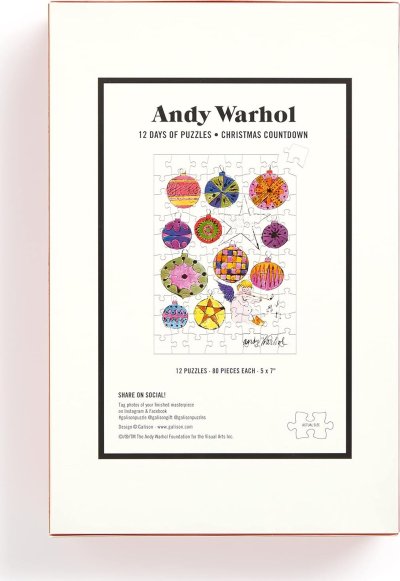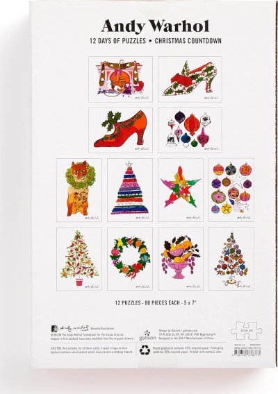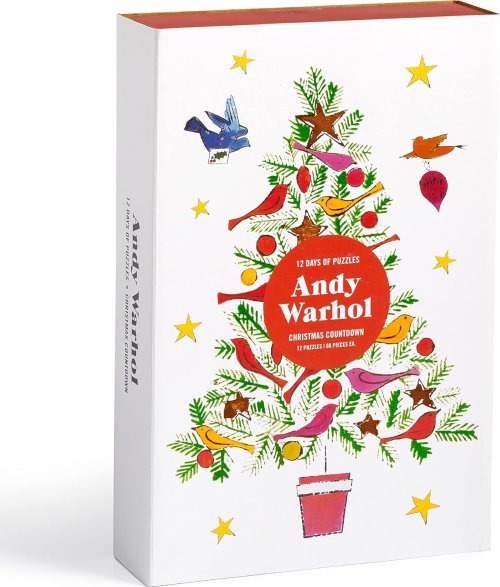 12 denný Adventný kalendár obsahuje 12 balení puzzle s Warholovými rozmarnými vianočnými obrazmi, kresbami a grafikami z 50. rokov. Po sňatí vonkajšieho obalu sa objavia predlohy a samotný adventný kalendár s 12 tradičnými okienkami. Každý deň otvoríte jedno, poskladáte puzzle a Vianoce sú tu. Súčasťou balenia je obojstranná predloha s 12 motívmi puzzle. Puzzle Andyho Warhola sú ideálnym darčekom pre milovníkov puzzle aj výtvarného umenia. Rozmer zloženého puzzle cca 12,7 x 17,8 cm