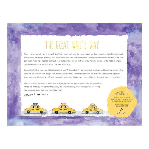 Ocenený dizajnér, ilustrátor a kreatívny riaditeľ Michael Storrings zachytáva čaro Broadwaya a divadelnej štvrti New Yorku. 2000dielne puzzle Svetlá na Broadwayi je zabalené v štýlovej robustnej krabici s matným povrchom, ideálne ako dá rek. Hlavné vlastnosti: obsahuje 2000 dielikov ilustrácie Michael Storring s jednotlivé dieliky do seba presne pasujú rozvíja logické myslenie a motoriku skvelý dizajn