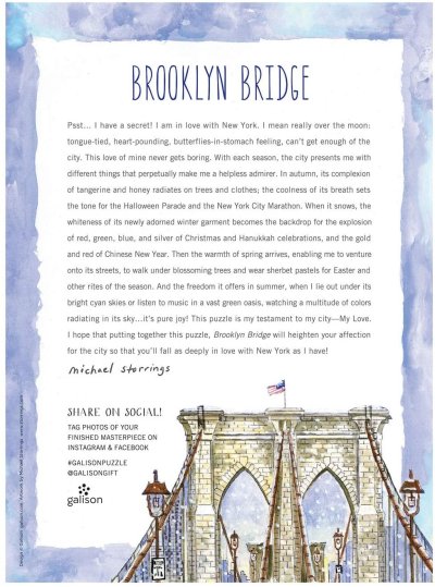 Oceňovaný dizajnér, ilustrátor a kreatívny riaditeľ Michael Storrings zachytáva podstatu slávneho newyorského Brooklynského mosta v zime. Puzzle je balené v pevných škatuliach s matným povrchom. Súčasťou je aj príloha s celým obrázkom puzzle. Hlavné vlastnosti: Obsahuje 1000 dielikovPotlačené netoxickými atramentmiPrémiová kvalita puzzleJednotlivé dieliky do seba presne pasujúRozvíja logické myslenie a motoriku