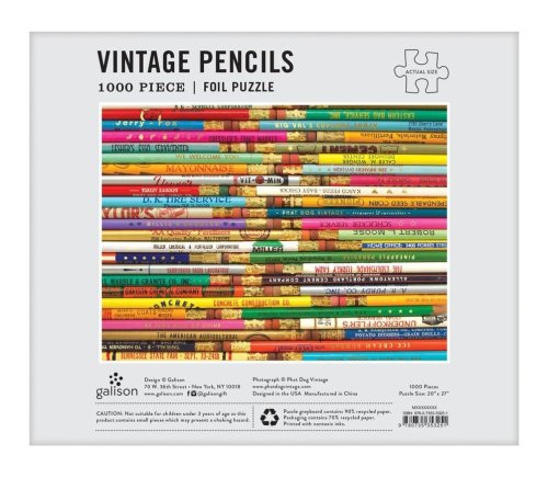 Puzzle s 1000 dielikmi hľadá neobvyklé a niekedy podivné objekty, o ktorých sa nepochybne predpokladá, že sú skryté v umení Phat Dog Vintage. Ponúka živú fotografiu ceruziek, ktoré Phat Dog Vintage zhromaždil z ciest. Toto jedinečné puzzle oslňuje kúsky, ktoré sú opatrené lesklými akcentmi zlatej fólie. Toto puzzle je zabalené v štýlovej robustnej krabičke s matným povrchom, aj so zlatými akcentmi. Obsahuje informačnú brožúru o umelcovi a obrázku. Hlavné vlastnosti: Obsahuje 1000 dielikovPotlačené netoxickými atramentmiPrémiová kvalita puzzleJednotlivé dieliky do seba presne pasujúRozvíja logické myslenie a motoriku