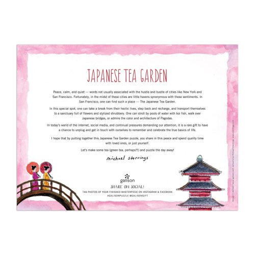 Oceňovaný dizajnér, ilustrátor Michael Storrings zachytáva pokoj, pohodu a ticho japonskej čajovej záhrady, ticho zasadenej do zhonu San Francisca. Puzzle sú vyrobené za použitia významného podielu recyklovaného papiera a ponúkajú špičkovú potlač nezávadnými farbami. Sú opatrené matnou povrchovou úpravou, ktorá zaisťuje za všetkých okolností verné podanie detailov i farieb. Ich zadná strana je potiahnutá hladkým, na dotyk príjemným povrchom, vďaka ktorému sa pri skladovaní rozloženého puzzle netvorí prach. Spolu so starostlivo zabalenými dielikmi nájdete v balení aj letáčik s návodným obrázkom, ktorý spravidla obsahuje ďalšie informácie o tvorcoch a pozadí vzniku diela. Dodávané v mimoriadne pevnej a pútavo spracovanej kartónovej krabičke vyrobenej z recyklovaného kartónu. Hlavné vlastnosti: 300 precízne vyrezaných dielikovvyrobených s použitím recyklovaných a udržateľne získaných materiálovstarostlivo vybraný motív od renomovaných tvorcov a umelcovpotlač a prevedenie najvyššej kvalityobsahuje návodný obrázok