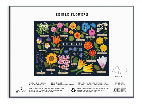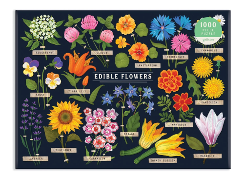 Toto 1000-dielne puzzle obsahuje farebné ilustrácie jedlých kvetín. Napríklad sirôtky, púpavy, karafiátu či nechtíka. Puzzle Galison sú balené v pevných škatuliach s matným povrchom pre ľahké použitie aj skladovanie. Ideálne aj ako darček. Hlavné vlastnosti: 1000 dielikovsúčasťou balenia je návodný obrázok rozvíja logické myslenie a motoriku