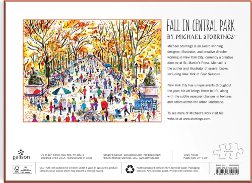 Predstavujeme vám Galison Puzzle Jeseň v Central Parku 1000 dielikov od najpredávanejšieho umelca Michaela Storringsa. Každý kus puzzle je krokom po magickej ceste, kde sa 18 000 stromov mení na najžiarivejšiu paletu jesenných farieb. Pripravte sa na cestu, ktorá oživí vaše zmysly a odhalí krásu, ktorú ste si možno nikdy nevšimli. Galison Puzzle Jeseň v Central Parku 1000 dielikov je majstrovským dielom, ktoré vás vtiahne do sveta, kde sa každý dielik skladá do dokonalej harmónie. Puzzle je navrhnuté tak, aby bolo prakticky bez prachu. Šedá doska puzzle obsahuje 90% recyklovaného papiera, zatiaľ čo obal zo 70% recyklovaného papiera. Je vyrobené zodpovedne z materiálu s certifikáciou FSC. Galison Puzzle Jeseň v Central Parku 1000 dielikov, sa každý dielik stáva časťou väčšieho obrazu – obrazu, ktorý prináša pokoj, radosť a pocit úspechu. Či už hľadáte dokonalý darček pre milovníka puzzle, alebo si chcete dopriať chvíle pokoja a sústredenia, toto puzzle je tou pravou voľbou. Je to nielen spôsob, ako stráviť čas, ale aj cesta k objaveniu a oceňovaniu krásy, ktorú príroda ponúka. Hlavné vlastnosti: obsahuje 1000 dielikov prémiová kvalita puzzle vyrobené s použitím recyklovaných a udržateľne získaných materiálov jednotlivé dieliky do seba presne pasujú rozvíja logické myslenie a motoriku Značka a certifikát FSC® (Forest Stewardship Council) zaručuje, že drevo, z ktorého bol produkt vyrobený, nebolo vyťažené nelegálne a z lesov obhospodarovaných šetrným či prírode blízkym spôsobom, v ktorom sú dodržiavané prísne environmentálne a sociálne požiadavky. Značka FSC® na výrobku znamená, že svojim nákupom pomáhate chrániť lesy a podporujete šetrné, zodpovedné či prírode blízke hospodárenie, vďaka ktorému sú naše lesy stabilnejšie, zdravšie, majú prirodzenú druhovú skladbu a lepšie odolávajú negatívnym následkom klimatických zmien.