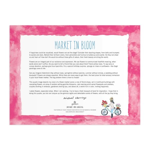 Ocenený dizajnér, ilustrátor Michael Storrings, nádherne ilustroval slnečný deň na trhu s kvetinami. Puzzle je balené v pevnej krabici, na opätovné použitie a skladovanie. Ideálne ako darček. Autorom obrázku je Michael Storrings. Puzzle sú vyrobené za použitia významného podielu recyklovaného papiera a ponúkajú špičkovú potlač nezávadnými farbami. Sú opatrené matnou povrchovou úpravou, ktorá zaisťuje za všetkých okolností verné podanie detailov i farieb. Ich zadná strana je potiahnutá hladkým, na dotyk príjemným povrchom, vďaka ktorému sa pri skladovaní rozloženého puzzle netvorí prach. Spolu so starostlivo zabalenými dielikmi nájdete v balení aj letáčik s návodným obrázkom, ktorý spravidla obsahuje ďalšie informácie o tvorcoch a pozadí vzniku diela. Dodávané v mimoriadne pevnej a pútavo spracovanej kartónovej krabičke vyrobenej z recyklovaného kartónu a udržateľne získaných materiálov s certifikáciou FSC®. Hlavné vlastnosti: 2000 precízne vyrezaných dielikovvyrobených s použitím recyklovaných a udržateľne získaných materiálovstarostlivo vybraný motív od renomovaných tvorcov a umelcovpotlač a prevedenie najvyššej kvalityobsahuje návodný obrázok