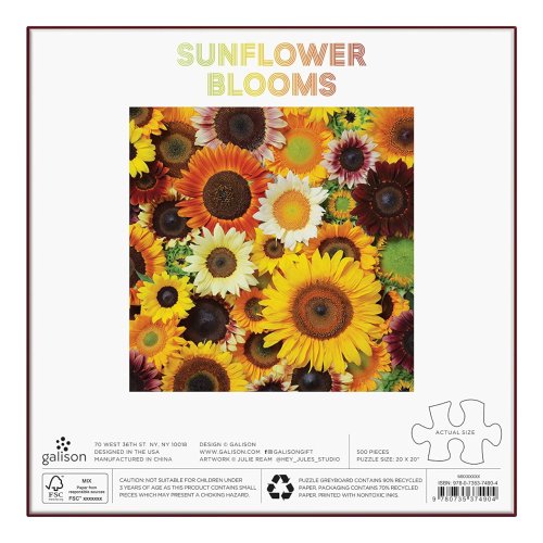 Oslnivá záplava kvetov otáčajúcich sa za slnkom vnesie do Vášho domova hrejivú atmosféru leta. Autorom obrázku je americká fotografka Julie Seabrook Ream. Puzzle Galison sú vyrobené za použitia významného podielu recyklovaného papiera a ponúkajú špičkovú potlač nezávadnými farbami. Sú opatrené matnou povrchovou úpravou, ktorá zaisťuje za všetkých okolností verné podanie detailov i farieb. Ich zadná strana je potiahnutá hladkým, na dotyk príjemným povrchom, vďaka ktorému sa pri skladovaní rozloženého puzzle netvorí prach. Spolu so starostlivo zabalenými dielikmi nájdete v balení aj letáčik s návodným obrázkom, ktorý spravidla obsahuje ďalšie informácie o tvorcoch a pozadí vzniku diela. Dodávané v mimoriadne pevnej a pútavo spracovanej kartónovej krabičke vyrobenej z recyklovaného kartónu a udržateľne získaných materiálov s certifikáciou FSC®. Hlavné vlastnosti: 500 precízne vyrezaných dielikovvyrobených s použitím recyklovaných a udržateľne získaných materiálovstarostlivo vybraný motív od renomovaných tvorcov a umelcovpotlač a prevedenie najvyššej kvalityobsahuje návodný obrázok