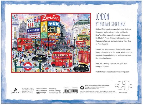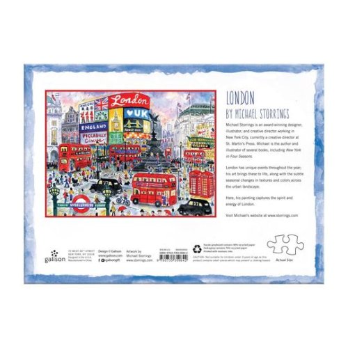 Ocenený ilustrátor Michael Storrings vo svojom umení zachytáva zvláštnu podstatu miest. Puzzle s detailnou ilustráciou Londýna s 1000 dielikmi oživuje ruch Piccadilly Circus. Puzzle sú zabalené v pevnej krabici. Hlavné vlastnosti: obsahuje 1000 dielikov potlačených netoxickými atramentmi prémiová kvalita puzzle jednotlivé dieliky do seba presne pasujú rozvíja logické myslenie a motoriku