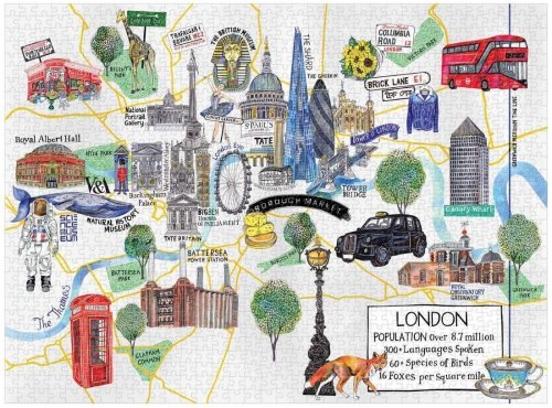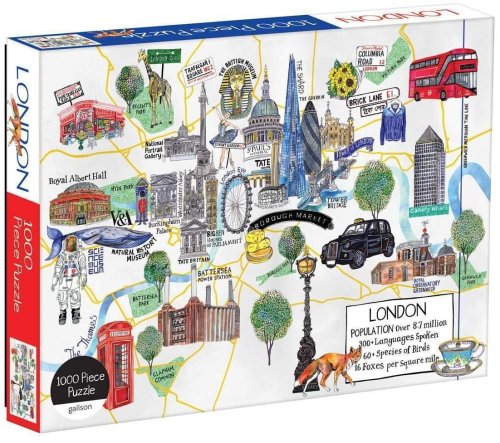 Spoznajte Londýn spracovaním tejto ilustrovanej mapy mesta s najznámejšími miestami a pamiatkami Londýna, vrátane Buckinghamského paláca, Trafalgarského námestia, Royal Albert Hall a mnohých ďalších. Pzzle je zabalené v štýlovej robustnej krabičke s matným povrchom. Dizajn Hennie Haworth. Hlavné vlastnosti: Obsahuje 1000 dielikovPotlačené netoxickými atramentmiPrémiová kvalita puzzleJednotlivé dieliky do seba presne pasujúRozvíja logické myslenie a motoriku