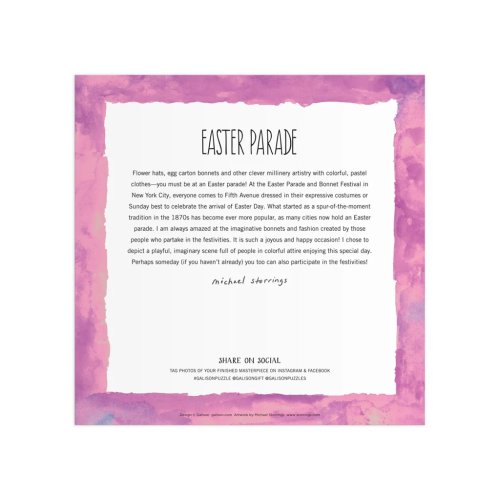 Predstavte si jar v plnom prúde, slnko hreje a celé mesto ožíva farbami a radosťou. Galison Puzzle Michael Storrings Veľkonočný sprievod 500 dielikov je kúzelný portál, ktorý vás a vašu rodinu zavedie priamo do srdca jarných slávností pred slávnou katedrálou svätého Patrika. S každým dielikom puzzle sa príbeh Veľkonočného sprievodu rozvíja pred vašimi očami. Žiarivé farby, veselé postavy a kvetinové klobúky - každý detail na tomto puzzle je starostlivo navrhnutý, aby vyvolal pocit radosti a oslavy. Či už je vonku daždivo alebo ste len hľadali spôsob, ako stráviť kvalitný čas s rodinou, toto puzzle je dokonalou voľbou. Navyše, keď je zložené, stane sa úžasným umeleckým dielom, ktoré môžete s hrdosťou vystaviť. Galison Puzzle Veľkonočný sprievod 500 dielikov je cesta k vytvoreniu niečoho krásneho, čo odráža váš záujem o umenie a tradíciu. Vďaka použitiu netoxických atramentov a materiálov s vysokým podielom recyklovaného papiera je toto puzzle aj voľbou, ktorá rešpektuje našu planétu. Puzzle je perfektným darčekom pre seba alebo pre vašich blízkych, aby spoločne prežili radosť zo spoločne stráveného času. Užite si kúzlo Veľkej noci a jari každý deň, kedykoľvek sa na svoje dokončené puzzle pozriete. Michael Storrings je ocenený dizajnér, ilustrátor a kreatívny riaditeľ. Hlavné vlastnosti: obsahuje 500 dielikov vyrobených s použitím recyklovaných a udržateľne získaných materiálov jednotlivé dieliky do seba presne pasujú rozvíja logické myslenie a motoriku Značka a certifikát FSC® (Forest Stewardship Council) zaručuje, že drevo, z ktorého bol produkt vyrobený, nebolo vyťažené nelegálne a pochádza z lesov obhospodarovaných šetrným či prírode blízkym spôsobom, v ktorom sú dodržiavané prísne environmentálne a sociálne požiadavky. Značka FSC® na výrobku znamená, že svojim nákupom pomáhate chrániť lesy a podporujete šetrné, zodpovedné či prírode blízke hospodárenie, vďaka ktorému sú naše lesy stabilnejšie, zdravšie, majú prirodzenú druhovú skladbu a lepšie odolávajú negatívnym následkom klimatických zmien.