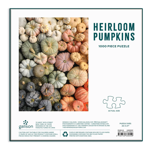 Privítajte jeseň s 1000-dielnym puzzle s tekvicami pôvodných odrôd. Nájdete tu krásnu fotografiu, na ktorej sa strieda fialová, zelená, žltá a oranžová, teda tekvica naaranžované tak, aby zobrazovali farby jesene. Puzzle Galison sú zabalené v matných, pevných škatuliach, sú perfektné ako darček. Môžete ju tiež použiť ako úložný priestor. V balení tiež obrázok plne zostaveného puzzle ako predloha. Hlavné vlastnosti: obsahuje 1000 dielikov prémiová kvalita puzzle jednotlivé dieliky do seba presne pasujú rozvíja logické myslenie a motorikunvhodné pre deti do 3 rokov
