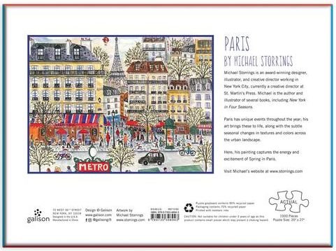 Oceňovaný dizajnér, ilustrátor a kreatívny riaditeľ Michael Storrings zachytáva zvláštnu podstatu a kúzlo miest v rôznych ročných obdobiach. Puzzle Paris 1000 ks oživuje kúzlo a romantiku slávneho mesta v tejto detailnej krajinomaľbe. Pre opätovné použitie aj skladovanie sú dieliky uložené v pevnej krabici. Ideálne aj ako dá rek. Puzzle Galison sú vyrobené za použitia významného podielu recyklovaného papiera a ponúkajú špičkovú potlač nezávadnými farbami. Sú opatrené matnou povrchovou úpravou, ktorá zaisťuje za všetkých okolností verné podanie detailov i farieb. Ich zadná strana je potiahnutá hladkým, na dotyk príjemným povrchom, vďaka ktorému sa pri skladovaní rozloženého puzzle netvorí prach. Spolu so starostlivo zabalenými dielikmi nájdete v balení aj letáčik s návodným obrázkom, ktorý spravidla obsahuje ďalšie informácie o tvorcoch a pozadí vzniku diela. Dodávané v mimoriadne pevnej a pútavo spracovanej kartónovej krabičke vyrobenej z recyklovaného kartónu. Hlavné vlastnosti: 1000 precízne vyrezaných dielikovvyrobených s použitím recyklovaných a udržateľne získaných materiálovstarostlivo vybraný motív od renomovaných tvorcov a umelcovpotlač a prevedenie najvyššej kvalityobsahuje návodný obrázok