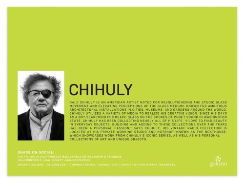Od čias, keď ako chlapec hľadal plážové sklo na pobreží Puget Sound v štáte Washington, umelec Dale Chihuly zbieral takmer celý svoj život prenosné rádiá. Jeho zbierka starých rádií je vystavená v tomto novom krásnom puzzle, ktoré si môže užiť každý. Puzzle sú balené v pevných škatuliach s matným povrchom. Hlavné vlastnosti: Obsahuje 1000 dielikovPotlačené netoxickými atramentmiPrémiová kvalita puzzleJednotlivé dieliky do seba presne pasujúRozvíja logické myslenie a motoriku