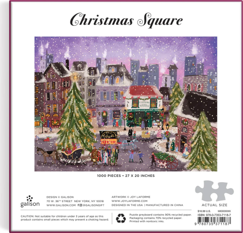 Vianočné puzzle od autorky Joy Laforme predstavuje pôvabnú, zasneženú vianočnú dedinu počas prázdnin, doplnenú o rozsvietené vianočné stromčeky, koledníky, dymiace komíny a ďalšie. Puzzle je balené v pevnej krabici, na opätovné použitie a skladovanie. Ideálne ako darček. Autorom obrázku je Joy Laforme. Puzzle sú vyrobené za použitia významného podielu recyklovaného papiera a ponúkajú špičkovú potlač nezávadnými farbami. Sú opatrené matnou povrchovou úpravou, ktorá zaisťuje za všetkých okolností verné podanie detailov i farieb. Ich zadná strana je potiahnutá hladkým, na dotyk príjemným povrchom, vďaka ktorému sa pri skladovaní rozloženého puzzle netvorí prach. Spolu so starostlivo zabalenými dielikmi nájdete v balení aj letáčik s návodným obrázkom, ktorý spravidla obsahuje ďalšie informácie o tvorcoch a pozadí vzniku diela. Dodávané v mimoriadne pevnej a pútavo spracovanej kartónovej krabičke vyrobenej z recyklovaného kartónu a udržateľne získaných materiálov s certifikáciou FSC®. Hlavné vlastnosti: 1000 precízne vyrezaných dielikovvyrobených s použitím recyklovaných a udržateľne získaných materiálovstarostlivo vybraný motív od renomovaných tvorcov a umelcovpotlač a prevedenie najvyššej kvalityobsahuje návodný obrázok
