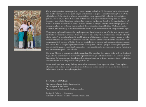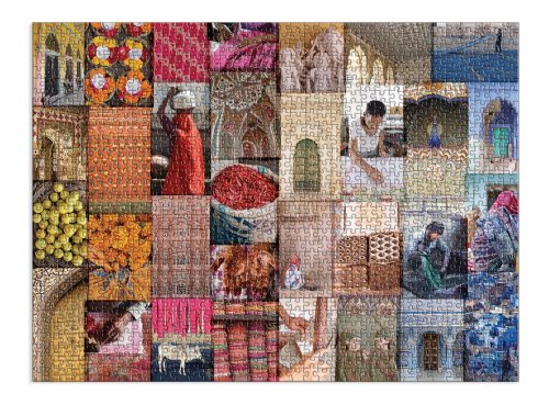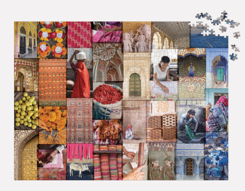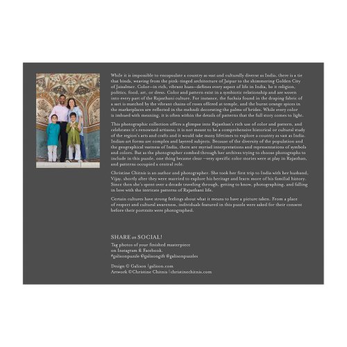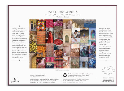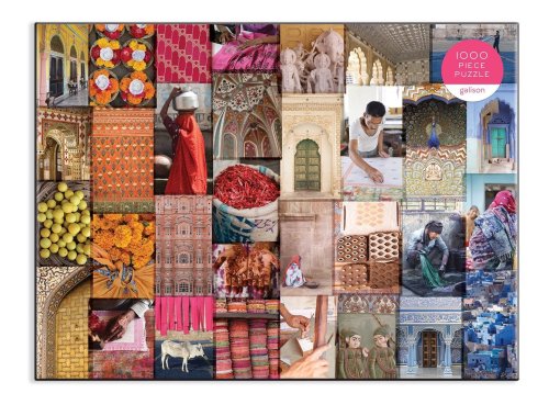 Vzory Indie: Cesta farbami, textíliami a živosťou Rádžasthánu. 1000dielne puzzle zložené z 32 fotografií z nádhernej knihy Christine Chitnis. Aj napriek tomu, že je India rozľahlá a kultúrne rôznorodá, fotografie Chitnis ju krásne spájajú, od nádhernej ružovej architektúry Džajpuru až po zlaté mesto Džajsalmer. Puzzle Galison sú zabalené v matných, pevných škatuliach, sú perfektné ako darček. Môžete ju tiež použiť ako úložný priestor. V balení tiež obrázok plne zostaveného puzzle ako predloha. Hlavné vlastnosti: Obsahuje 1000 dielikov Prémiová kvalita puzzle Jednotlivé dieliky do seba presne pasujú Rozvíja logické myslenie a motoriku