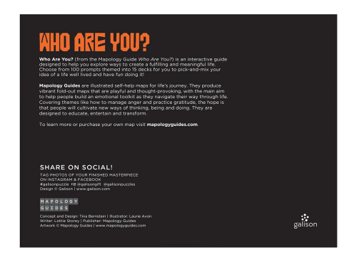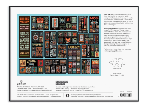 Urobte z obyčajného neobyčajné! Kto si? Motív puzzle sa skladá z ilustrácií z Mapology Guides – svojpomocnej mapy pre životnú cestu. Inšpirujúca mriežka ilustrácií afirmácií, vyhlásení a obrázkov s podnetným textom v angličtine. Súčasťou balenia je predloha skladaného motívu. Rozmer zloženého puzzle cca 69 x 51 cm