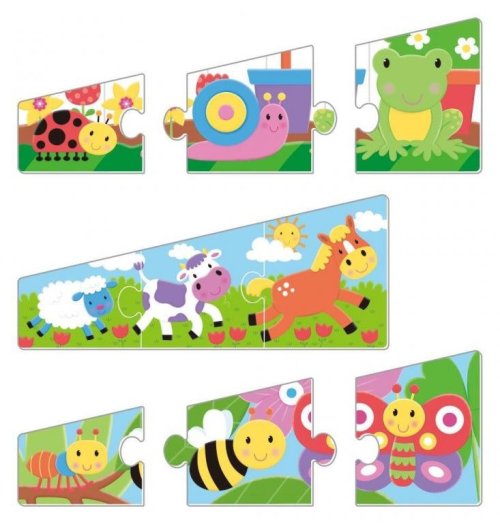 Sada šiestich puzzle s humornými postavičkami zvieratiek pre veľmi malé deti. Každé puzzle sa skladá z troch dielikov a pomôže pri rozvíjaní rozoznávania veľkosti, pretože zvieratká sú zoradené podľa veľkosti. Ideálne prvé puzzle obsahujúce menej dielikov, ktoré sa rýchlo skladá. Približná veľkosť jedného puzzle 10 x 24 cm. Vhodné pre deti od 18 mesiacov. Rozmer zloženého puzzle cca 10 x 24 cm