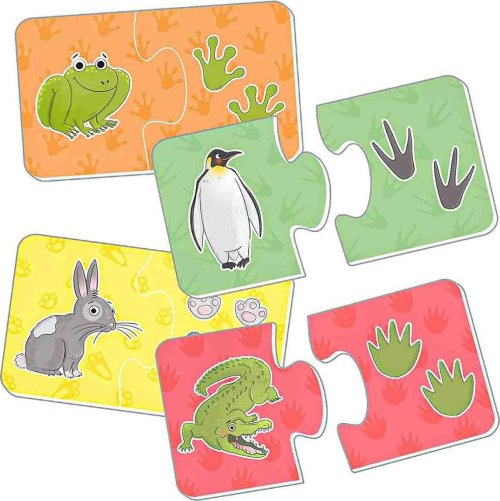 Puzzle obsahuje 22 dvojdielnych puzzle, na ktorých sú zvieratká, ktoré musia byť spárované so stopami, ktoré po sebe zanechali. Najprv sa deti učia párovať farby a potom postupne rozpoznávať rôzne stopy zvierat. Puzzle pomáhajú podporovať kognitívny vývoj detí, ako je rozpoznávanie farieb a tvarov, ale aj rozpoznávanie zvieracích stôp. Približná veľkosť jedného puzzle: 12 x 7 cm. Rozmer zloženého puzzle cca 12 x 7 cm
