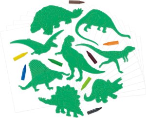 8 šablón s motívmi dinosaurov, 20 listov papiera, 8 voskoviek v rôznych farbách.