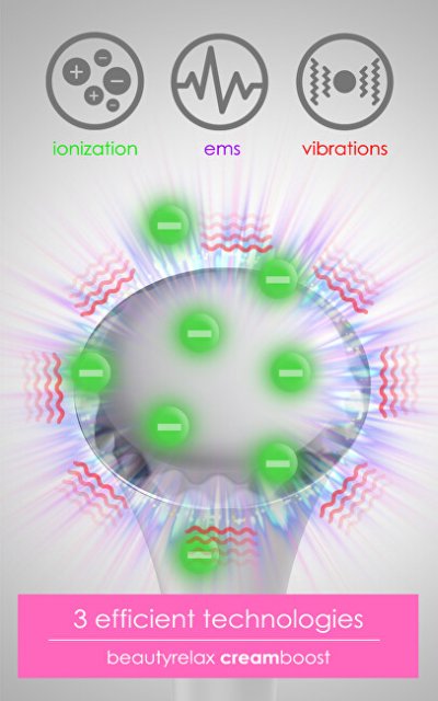 Kozmetický prístroj Creamboost násobne zvýši účinnosť kozmetických prípravkov. Výživové látky sa lepšie vstrebajú do pleti. BeautyRelax Creamboost ponúka kombináciu troch technológií: galvanický prúd, EMS elektrické mikropulzy a vysokofrekvenčné vibrácie. BeautyRelax Creamboost obnovuje mladistvý vhľad vašej pleti. Dosiahnite vyššiu úroveň starostlivosti pre krásnu a žiarivú pleť. Galvanický prúd – záporná ionizáciaGalvanický prúd napomáha penetrovať výživové látky z kozmetických sér hlboko do pokožky. Absolútny turboefekt pre vaše kozmetické prípravky! Je zabránené vyschnutiu na povrchu pleti bez ďalšieho využitia. EMS elektrické mikropulzyAplikačná hlavica kozmetického prístroja prenáša pri kontakte s pleťou jemné elektrické mikropulzy, ktoré prenikajú cez vrchnú časť pokožky priamo k tvárovým svalom. Dochádza ku kontrakcii svalov a tým ich posilneniu. V oblasti tváre docielite zlepšenie textúry pokožky, jej tónu a nárastu elasticity. VibrácieVibrácie podporujú krvný obeh. Lymfatický systém je pozitívne stimulovaný pre lepší odvod nečistôt a škodlivín. Jemná vysokofrekvenčná vibračná masáž patrí z technologického hľadiska medzi najjednoduchšiu, ale zároveň veľmi účinnú techniku ošetrenia pleti.