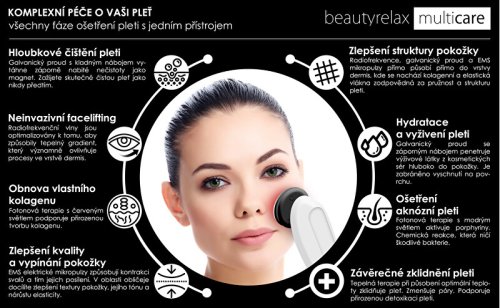 Profesionálny kozmetický prístroj na ošetrenie pleti ponúka moderné technológie, ktoré sú najpoužívanejšie v dermatológii a kozmetickom odvetví. Začnite sa o pleť starať na profesionálnej úrovni aj vy. Čo môžete očakávať? Postupné zlepšenie pružnosti pleti. Pokožka bude pôsobiť sviežejším dojmom. Elimináciu hlbokých aj jemných mimických vrások. Zvýraznenie charakteristických kontúr tváre. Stimuláciu tvárových svalov. Prekrvenie a okysličenie podkožného tkaniva. Jemná lymfatická masáž na redukciu opuchov tváre. Účinnú podporu bunkového metabolizmu a vstrebávanie živín. Hlavné výhody Neinvazívne ošetrenie (prístroj nepreniká priamo cez pokožku). Ošetrenie bez akýchkoľvek nepríjemných pocitov. Bez nežiaducich trvalých zmien pigmentácie pleti. Ihneď po procedúre je možné použiť kozmetické prípravky. Bez obmedzenia pokračovať v akýchkoľvek aktivitách (napr. pred spoločenským programom). Špecifikácia 5 automatických programov Multicare s prednastavenými režimami ošetrenia pleti: Rádiofrekvencia Aplikačná hlavica generuje energiu prostredníctvom rádiofrekvenčných vĺn s úplne špecifickým výkonom a frekvenciou. Rádiofrekvenčné vlny sú optimalizované na to, aby spôsobili tepelný gradient, ktorý významne ovplyvňuje procesy vo vrstve dermis. Dodaná energia aktivuje remodeláciu kolagénových vlákien a elastínu. Maximálne možné zacielenie energie aj v lokalitách s výraznejšou tukovou vrstvou a následná excitácia metabolických procesov má významný vplyv na veľmi efektívne vyhladenie ovisnutých a deformovaných kontúr. Galvanický prúd Aplikačná hlavica vytvára na svojom povrchu prúd s možnosťou premenlivého náboja. Riadiaca jednotka kozmetického prístroja umožňuje úpravu galvanického prúdu takým spôsobom, aby dochádzalo ku kladnému alebo zápornému náboju. Kladná a záporná ionizácia má odlišné účinky na pleť. Kladná ionizácia - dôkladné vyčistenie pleti Kladná ionizácia vytiahne záporne nabité nečistoty ako magnet. Zažijete skutočne čistú pleť ako nikdy predtým. Iba čistá pleť je tá zdravá! Záporná ionizácia - hĺbkové vyživenie pleti Galvanický prúd penetruje výživové látky z kozmetických sér hlboko do pokožky. Je zabránené vyschnutiu na povrchu. Absolútny turboefekt pre vaše kozmetické prípravky! EMS Náš tvár je pretkaný štruktúrou svalov. Tvárové svaly sú zodpovedné za výraz a mimiku. Pôsobením času svaly strácajú prirodzenú pružnosť a elasticitu. Pleť pôsobí fádnym a unaveným dojmom. Aplikačná hlavica BeautyRelax Multicare prenáša pri kontakte s pleťou jemné elektrické mikropulzy, ktoré prenikajú cez vrchnú časť pokožky priamo k tvárovým svalom. Výkon a frekvencia elektrických pulzov sú špeciálne upravené tak, aby umožnili účinné, ale zároveň bezbolestné ošetrenie tváre. Dochádza ku kontrakcii svalov a tým ich posilneniu. Kolagénne a elastické vlákna sú mechanicky stimulované. V oblasti tváre docielite zlepšenie textúry pokožky, jej tónu a nárastu elasticity. Pleť má omladený a prežiarený vzhľad. To všetko neinvazívne a bez akýchkoľvek nepríjemných pocitov. Vibrácie Správna funkcia lymfatického systému platí nielen pre telesné končatiny, ale aj pre našu tvár. Pokiaľ máme lymfu a krvný obeh v poriadku, odvod nečistôt z krvi prebieha násobne lepším spôsobom. Zlepšenie krvného obehu = stimulácia lymfatického systému = lepší odvod nečistôt a škodlivín z tela = krásna a zdravá pleť. Jednoduchá rovnica, ktorá platí nielen pre tvár, ale aj pre celé naše telo. Jemná vibračná masáž patrí z technologického hľadiska medzi najjednoduchšiu, ale zároveň veľmi účinnú techniku ošetrenia pleti. Fotonová terapia Svetlo je zjednodušene viditeľná časť elektromagnetického žiarenia rôznej frekvencie. Dosahuje rôzne vlnové dĺžky v intervale 390 až 760nm (nanometrov). Ľudské oko je schopné vnímať svetlo s vlnovými dĺžkami v rozsahu od 400 do 800nm. Pri fotónovej terapii preniká svetlo do tela ako prúd energie vo forme fotónov. Je vedecky dokázané, že rôzne vlnové dĺžky svetla majú za následok špecifické účinky pri starostlivosti o pleť. Štúdie overili reálny pozitívny terapeutický prínos pre živé tkanivá a organizmy na bunkovej úrovni. Ďalšia terapia: Tepelná terapia (červené a modré svetlo) - Ošetrenie pleti aplikačnou hlavicou s nastavenou optimálnou teplotou výrazne ovplyvňuje funkciu lymfatického systému tváre a jeho látkovú výmenu. Pôsobením teploty okolo 15 ° C je obvykle ošetrenie pleti zakončené. Pleť sa upokojí a dochádza k stiahnutiu kožných pórov.