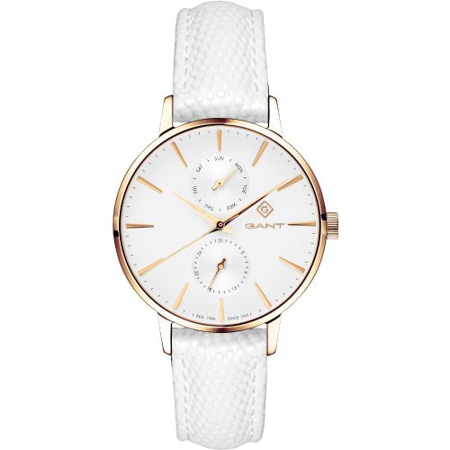 Dámske náramkové hodinky Napájanie z batérie Strojček SEIKO VX3P Priemer puzdra 36,0 mm Puzdro v tvare kruhu Oceľové puzdro Zlatistá farba púzdra Kožený ťah Biela farba ťahu Ručičkový ciferník Šedá farba ciferníka ciferník s dvanástimi indexmi Materiál Dátum