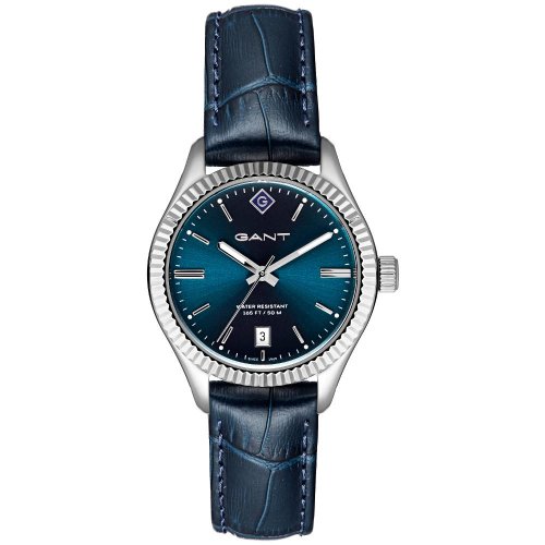 Dámske náramkové hodinky Napájanie z batérie Strojček 2115 Priemer puzdra 34,0 mm Puzdro v tvare kruhu Oceľové puzdro Strieborná farba puzdra Kožený ťah Modrá farba ťahu Ručičkový ciferník Modrá farba ciferníku Ciferník s dvanástimi indexmi Materiál počas skla - minerál