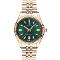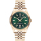 Dámske náramkové hodinky Napájanie z batérie Strojček MIYOTA 2115 Priemer púzdra 37,5 mm Púzdro v tvare kruhu Oceľové púzdro Ružové zlato farba púzdra Oceľový ťah Ružové zlato farba ťahu Ručičkový ciferník Zelená farba ciferníku Ciferník s dvanástimi Dátum