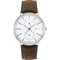 Pánske náramkové hodinky Napájanie z batérie Strojček VD77 Priemer puzdra 40,0 mm Puzdro v tvare kruhu Oceľové puzdro Strieborná farba puzdra Kožený ťah Hnedá farba ťahu Ručičkový ciferník Biela farba ciferníku Ciferník s dvanástimi indexmi Materiál skla
