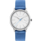 Dámske náramkové hodinky Napájanie z batérie Strojček 6P26 Priemer puzdra 36,0 mm Puzdro v tvare kruhu Oceľové puzdro Strieborná farba púzdra Kožený ťah Modrá farba ťahu Ručičkový ciferník Biela farba ciferníka Ciferník s dvanástimi indexmi Materiál skla