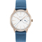 Dámske náramkové hodinky Napájanie z batérie Strojček 6P26 Priemer puzdra 36,0 mm Puzdro v tvare kruhu Oceľové puzdro Ružové zlato farba púzdra Kožený ťah Modrá farba ťahu Ručičkový ciferník Biela farba ciferníku Ciferník s dvanástimi indexmi Materiál skla Dátum