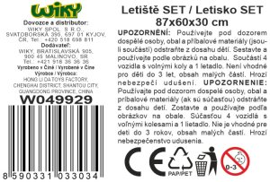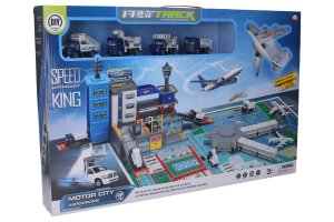 Garáž letiska set 4 autá a lietadlo. Rozmery hracej plochy 87x60x30 cm. Obsahuje 4 kovové autíčka 7 cm (voľné kolesá), a 1 kovové lietadlo 13x13 cm.