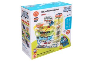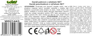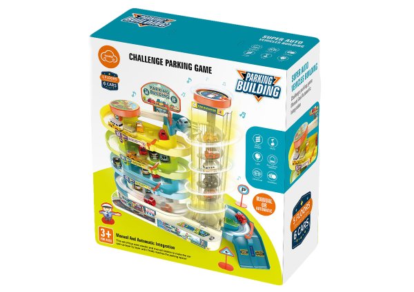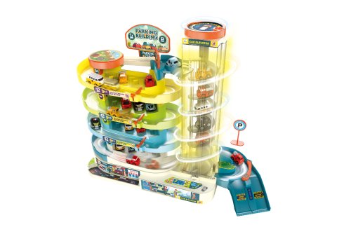 Garáž poschodová s výťahom 6 áut. Rozmery 30x13x34 cm. Svetelné a zvukové efekty. 3xAA batérie nie sú súčasťou. Prevádzka výťahu na batérie či manuálne (prepínač). Obrázkový návod na zloženie na zadnej strane obalu.