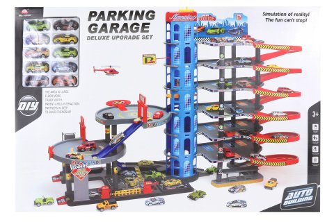 Veľká plastová garáž s heliportom. Garáž má celkom 6 poschodí. Balenie obsahuje 10 autíčok. Veľkosť autíčka je cca 6,5 cm. Rozmery balenia cca 85,5 x 58 x 14 cm. Vek 3+