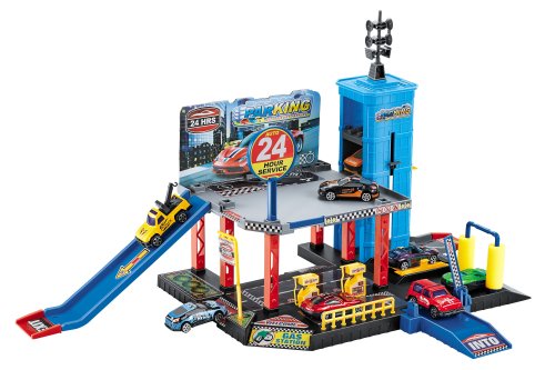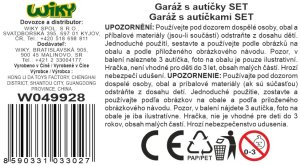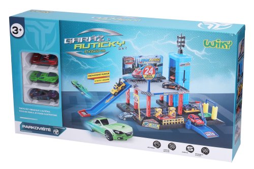 Garáž s výťahom a čerpacou stanicou. Rozmery zostavenej garáže 57x35x33 cm. Balenie obsahuje 3 kovové autíčka 7 cm, voľné kolesá.