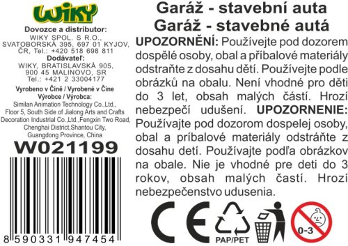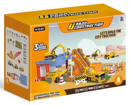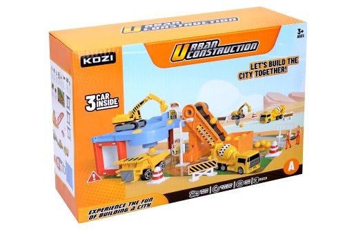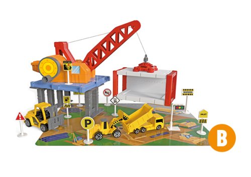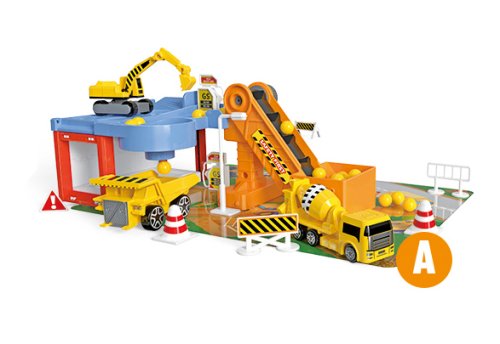 Obsahuje garáž, sklápač, bager, domiešavač, prepravný pás, značky.