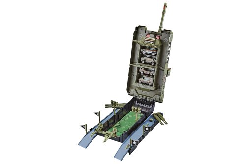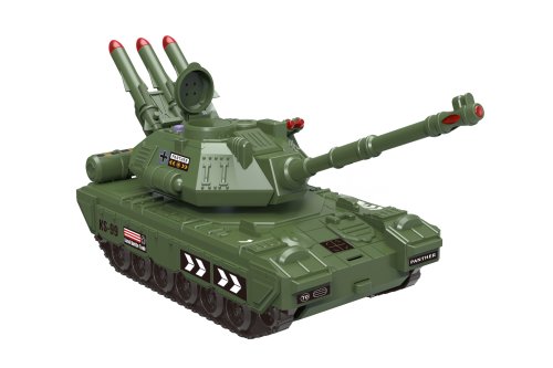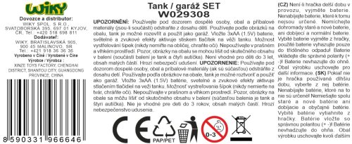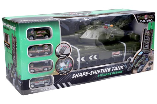 Garáž tank 44 cm 4 autá. Dĺžka tanku 44 cm. Tank vydáva svetelné a zvukové efekty. Aktivácia efektov 4 tlačidlami na veži tanku. 4 autá 7 cm, voľné kolesá. Tank je možné roztvoriť a na strany pripojiť rampy. 3 kanóny na vystreľovacie šípky. 3xAA batérie nie sú súčasťou.