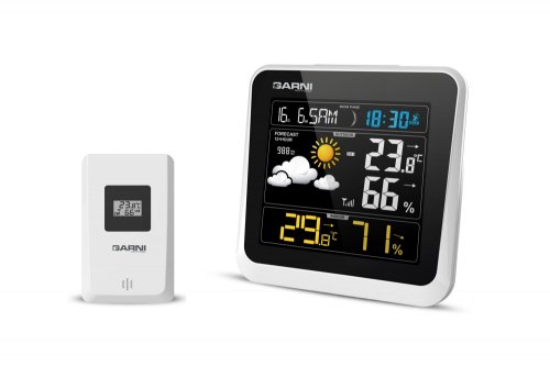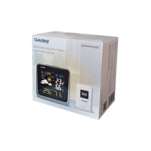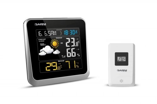 Meteorologická stanica so špičkovým inverzným farebným VA displejom s časom a dátumom riadenými rádiovým signálom DCF-77, budíkom, meraním vnútornej teploty, relatívnej vlhkosti a absolútneho barometrického tlaku a bezdrôtovým čidlom na meranie vonkajšej teploty a relatívnej vlhkosti.