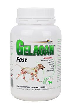 Doplnkové krmivo pri akútnom bolestivom stave. Gelacan ® Fast je doplnkové krmivo s bioaktívnymi kolagénnymi peptidmi, extraktom z Boswellie serraty, vitamínmi E, C a selénom, vhodné na akútnu aplikáciu pri bolestivosti pohybového aparátu psov. Gelacan ® Fast obsahuje komplex účinných zložiek pozitívne ovplyvňujúcich zápalové procesy v kĺbových, šľachových a väzivových tkanivách, zvyšujúcich kĺbovú pohyblivosť a obmedzujúcich bolestivosť kĺbov v pokoji aj pri pohybe. Indikácia: