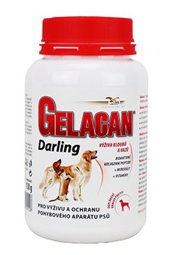 Kolagénna výživa kĺbov s vitamínmi. Doplnkové krmivo s vysokým obsahom kolagénnych peptidov CHP, vitamínu E, selénu a základných minerálnych látok potrebných pre správnu výživu a vývoj kostí a kĺbov. Novo pečeňová aróma. Gelacan ® Darling obsahuje kolagénne peptidy CHP, ktoré vyživujú a regenerujú kĺbové chrupavky, šľachy, väzy a kosti a zmierňujú až odstraňujú tak následky predchádzajúcej nedostatočnej výživy alebo poškodenia kĺbov, ich deformácii, zabraňujú ďalšiemu úbytku chrupaviek, zlepšujú hybnosť a zhybňujú. Ďalej obsiahnuté vitamíny, minerálne látky a stopové prvky vo vyváženom pomere vhodne obohacujú kŕmnu dávku. Optimálny pomer účinných látok zvyšuje vitalitu psa, zlepšuje telesnú kondíciu a urýchľuje regeneráciu organizmu. Vhodné podávať: