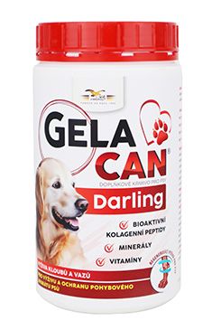 Kolagénna výživa kĺbov s vitamínmi. Doplnkové krmivo s vysokým obsahom kolagénnych peptidov CHP, vitamínu E, selénu a základných minerálnych látok potrebných pre správnu výživu a vývoj kostí a kĺbov. Novo pečeňová aróma. Gelacan ® Darling obsahuje kolagénne peptidy CHP, ktoré vyživujú a regenerujú kĺbové chrupavky, šľachy, väzy a kosti a zmierňujú až odstraňujú tak následky predchádzajúcej nedostatočnej výživy alebo poškodenia kĺbov, ich deformácii, zabraňujú ďalšiemu úbytku chrupaviek, zlepšujú hybnosť a zhybňujú. Ďalej obsiahnuté vitamíny, minerálne látky a stopové prvky vo vyváženom pomere vhodne obohacujú kŕmnu dávku. Optimálny pomer účinných látok zvyšuje vitalitu psa, zlepšuje telesnú kondíciu a urýchľuje regeneráciu organizmu. Vhodné podávať:
