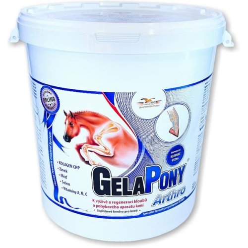 Gelapony Arthro je koncentrované doplnkové krmivo s vysokým obsahom kolagénu CHP a vitamínov. Gelapony Arthro regeneruje tkanivá kĺbového systému, posilňuje kosti, väzy a šľachy. Vďaka vysokému obsahu kolagénu CHP (98,7 %) je vhodné pre intenzívne zaťažované kone a pri chronických pohybových problémoch.