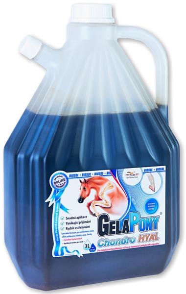 Gelapony ® Chondro Hyal Biosol je doplnkové krmivo pre kone v záujmovom chove, dostihové a športové - komplexné perorálne chondronutraceutikum s bioaktívnymi kolagénnymi peptidmi, glykozaminoglykánmi a kyselinou hyalurónovou k intenzívnej výžive a regenerácii kĺbového systému vysoké športovej záťaži. Vďaka vysoko efektívnej kombinácii účinných látok zvyšuje Gelapony ® Chondro Hyal Biosol elasticitu kĺbových chrupaviek, väzov a šliach, obnovuje pohyblivosť a obmedzuje bolestivosť kĺbov. Forma biosolu zaisťuje rýchle a jednoduché vstrebávanie účinných látok a umožňuje jednoduchú aplikáciu prípravku. Indikácia: