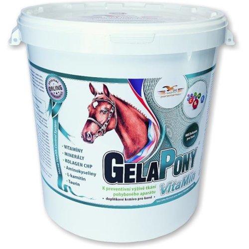 Bioaktívne kolagénne peptidy podporujú u mladých koní správny rast a vývin kĺbov, kostí, väzov a šliach. U dospelých koní chráni pohybový aparát pred opotrebovaním v dôsledku zvýšenej fyzickej záťaže či veku. Vitamíny, minerálne látky a aminokyseliny vo vyváženom pomere dopĺňajú základnú kŕmnu dávku. Optimálny pomer účinných látok zvyšuje vitalitu koňa, zlepšuje telesnú kondíciu a urýchľuje regeneráciu po záťaži. Vitamín E, selén a ďalšie antioxidanty obsiahnuté v prípravku chránia telesné tkanivá pred škodlivým pôsobením voľných peroxidových radikálov, ktoré ničia steny buniek a spôsobujú ich predčasné odumieranie. L-cystín je zdrojom organickej síry, ktorá je potrebná pre správnu tvorbu kolagénu a tvorbu a kvalitu rohoviny kopýt a srsti. Kvalitu kopytnej rohoviny tiež pozitívne ovplyvňujú biotín, zinok a vitamín A. Vitamíny skupiny B majú pozitívny vplyv predovšetkým na nervovú sústavu koňa a celkový metabolizmus koňa. L-lyzín a L-arginín podporujú správny vývoj a funkciu kostrovej svaloviny. Zloženie: srvátka sušená, kolagén hydrolyzovaný (12 %), chlorid sodný, uhličitan vápenatý, chlorid draselný, oxid horečnatý, škorica. Nutričné doplnkové látky na 1 kg: železo (Bioplex Fe – chelát železa a bielkovinových hydrolyzátov) 1 000 mg, zinok (Bioplex Zn – chelát zinku a bielkovinových hydrolyzátov) 1 170 mg, mangán (Bioplex Mn – chelát mangán mg, meď (Bioplex Cu – chelát medi a bielkovinových hydrolyzátov) 166 mg, jód (jodid draselný) 67 000 µg, selén (Sel-Plex – organická forma selénu, ktorú produkujú Saccharomyces cerevisiae CNCM I-3060 vitamín C 3 000 mg, vitamín A 100 000 MJ, vitamín D 3 100 000 MJ, vitamín E 2 000 mg, vitamín B 1 1 000 mg, vitamín B 2 400 mg, D-pantoténán vápenatý 20 mg 12 1 000 µg, biotín 10 000 µg, kyselina listová 400 000 µg, L-karnitín 440 mg, L-cystín 500 mg, L-arginín 500 mg, L-lyzín monohydrochlorid 500 mg. Zloženie v dennej dávke 30 g: bioaktívne kolagénne peptidy 3 600 mg, vápnik 330 mg, horčík 150 mg, železo 30 mg, mangán 12 mg, meď 5 mg, zinok 35 mg, sodík 570 mg, draslík 252 mg, 3 000 MJ, vitamín B 1 30 mg, vitamín B 2 12 mg, vitamín B 5 6 mg, vitamín B 6 4,5 mg, vitamín B 12 30 µg, vitamín C 90 mg, vitamín D 3 3000 MJ, vitamín E 60 mg 12 000 µg, L-karnitín 13 mg, L-cystín 15 mg, L-arginín 15 mg, L-lyzín 15 mg. Kŕmny návod: Prípravok podávajte denne na doplnenie potreby vitamínov, stopových prvkov a minerálnych látok počas zvýšenej športovej záťaže či zvýšenej potreby v čase rastu a reprodukcie. Odporúčame trvalé podávanie ako súčasť bežnej kŕmnej dávky pre zdravie koní. Dennú dávku odmerajte a primiešajte ku kŕmnej dávke. Najlepšie sa osvedčilo primiešanie do dávky jadra a ľahké zvlhčenie. Odporúčané dávkovanie – kôň 30 g denne (cca 3 odmerky), žriebä/poník 15 g denne (cca 1,5 odmerky). „No Doping!“ – GelaPony VitaMín neobsahuje žiadne látky považované za doping koní. Jeho podávanie je neobmedzené v priebehu celej športovej prípravy aj počas pretekov. Skladovanie: Uchovávajte v uzavretom obale v suchu a pri teplote do 25 °C.