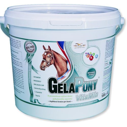 Bioaktívne kolagénne peptidy podporujú u mladých koní správny rast a vývin kĺbov, kostí, väzov a šliach. U dospelých koní chráni pohybový aparát pred opotrebovaním v dôsledku zvýšenej fyzickej záťaže či veku. Vitamíny, minerálne látky a aminokyseliny vo vyváženom pomere dopĺňajú základnú kŕmnu dávku. Optimálny pomer účinných látok zvyšuje vitalitu koňa, zlepšuje telesnú kondíciu a urýchľuje regeneráciu po záťaži. Vitamín E, selén a ďalšie antioxidanty obsiahnuté v prípravku chránia telesné tkanivá pred škodlivým pôsobením voľných peroxidových radikálov, ktoré ničia steny buniek a spôsobujú ich predčasné odumieranie. L-cystín je zdrojom organickej síry, ktorá je potrebná pre správnu tvorbu kolagénu a tvorbu a kvalitu rohoviny kopýt a srsti. Kvalitu kopytnej rohoviny tiež pozitívne ovplyvňujú biotín, zinok a vitamín A. Vitamíny skupiny B majú pozitívny vplyv predovšetkým na nervovú sústavu koňa a celkový metabolizmus koňa. L-lyzín a L-arginín podporujú správny vývoj a funkciu kostrovej svaloviny. Zloženie: srvátka sušená, kolagén hydrolyzovaný (12 %), chlorid sodný, uhličitan vápenatý, chlorid draselný, oxid horečnatý, škorica. Nutričné doplnkové látky na 1 kg: železo (Bioplex Fe – chelát železa a bielkovinových hydrolyzátov) 1 000 mg, zinok (Bioplex Zn – chelát zinku a bielkovinových hydrolyzátov) 1 170 mg, mangán (Bioplex Mn – chelát mangán mg, meď (Bioplex Cu – chelát medi a bielkovinových hydrolyzátov) 166 mg, jód (jodid draselný) 67 000 µg, selén (Sel-Plex – organická forma selénu, ktorú produkujú Saccharomyces cerevisiae CNCM I-3060 vitamín C 3 000 mg, vitamín A 100 000 MJ, vitamín D 3 100 000 MJ, vitamín E 2 000 mg, vitamín B 1 1 000 mg, vitamín B 2 400 mg, D-pantoténán vápenatý 20 mg 12 1 000 µg, biotín 10 000 µg, kyselina listová 400 000 µg, L-karnitín 440 mg, L-cystín 500 mg, L-arginín 500 mg, L-lyzín monohydrochlorid 500 mg. Zloženie v dennej dávke 30 g: bioaktívne kolagénne peptidy 3 600 mg, vápnik 330 mg, horčík 150 mg, železo 30 mg, mangán 12 mg, meď 5 mg, zinok 35 mg, sodík 570 mg, draslík 252 mg, 3 000 MJ, vitamín B 1 30 mg, vitamín B 2 12 mg, vitamín B 5 6 mg, vitamín B 6 4,5 mg, vitamín B 12 30 µg, vitamín C 90 mg, vitamín D 3 3000 MJ, vitamín E 60 mg 12 000 µg, L-karnitín 13 mg, L-cystín 15 mg, L-arginín 15 mg, L-lyzín 15 mg. Kŕmny návod: Prípravok podávajte denne na doplnenie potreby vitamínov, stopových prvkov a minerálnych látok počas zvýšenej športovej záťaže či zvýšenej potreby v čase rastu a reprodukcie. Odporúčame trvalé podávanie ako súčasť bežnej kŕmnej dávky pre zdravie koní. Dennú dávku odmerajte a primiešajte ku kŕmnej dávke. Najlepšie sa osvedčilo primiešanie do dávky jadra a ľahké zvlhčenie. Odporúčané dávkovanie – kôň 30 g denne (cca 3 odmerky), žriebä/poník 15 g denne (cca 1,5 odmerky). „No Doping!“ – GelaPony VitaMín neobsahuje žiadne látky považované za doping koní. Jeho podávanie je neobmedzené v priebehu celej športovej prípravy aj počas pretekov. Skladovanie: Uchovávajte v uzavretom obale v suchu a pri teplote do 25 °C.