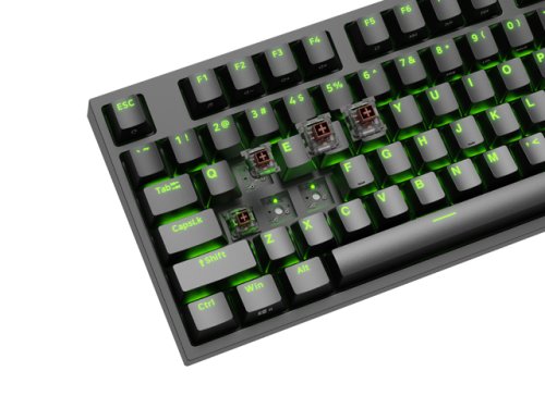 ŠPECIFIKÁCIA: Komunikácia: Káblové pripojenie Rozhranie: USB Špecializácia: Herný Layout: US Mechanizmus kláves: Mechanický Model spínačov: Kailh Box Brown V2 Typ spínača: Klikací Typ klávesnice: TKL Podsvietenie: Áno Farba podsvietenia: RGB Počet režimov podsvietenia: 18 Dĺžka cm Počet tlačidiel: 87 Multimediálne klávesy: Áno Počet multimediálnych tlačidiel: 11 Životnosť kláves: 80 mil. Frekvencia vzorkovania: 1 000 Hz Bod aktivácie: 2 mm Akčná sila: 55 g Doba odozvy: 1 ms Profil: Nie Podporované operačné systémy: Windows 8 Windows 7 Windows 11 Windows 10 Android Software: Áno Hardwarové požiadavky: Zariadenie s portom USB-A Technológia potlače kláves: Dvojité vstrekovanie Vstavaná pamäť: Áno Profil prepínača: Vysoký Konštrukcia: Konštrukcia bez plávajúcich klávesov (uzavretá) Štandardné rozloženie: ANSI Materiál: ABS Funkcia : Vymeniteľné spínače "HOT SWAP" Dostupné profily Dostupné makrá Záznam makier: Áno Anti-ghosting: Áno Konektory: USB typu A Opletený vodič: Gumová vrstva Farba: Čierna Napájanie: USB (5V) Dodávané príslušenstvo: Klip, 2 náhradné mechanické spínače Dĺžka: 358 mm Šírka: 133 mm Výška: 38 mm Hmotnosť: 1005 g
