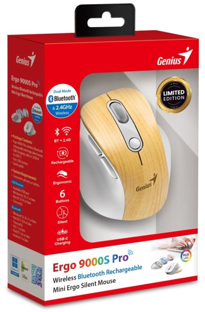 Všetko to klikanie a scrollovanie je tak vo výsledku príjemnejšie a bez bolesti aj pri dlhotrvajúcej činnosti. Myš Genius Ergo 9000S Pro je vybavená optickým senzorom s nastaviteľným rozlíšením až 2400 DPI , vďaka čomu sa prispôsobí vašim požiadavkám na rýchlosť a presnosť pohybu. Bezdrôtové pripojenie zaisťuje technológia Bluetooth a miniatúrny USB prijímač s rozhraním 2,4 GHz.