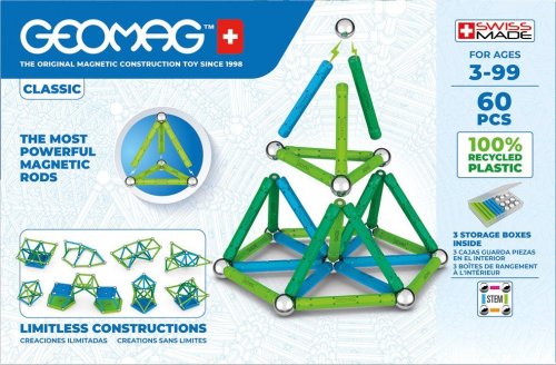 Geomag Classic 60 dielikov predstavuje kvalitnú a ekologickú stavebnicu, ktorá vďaka svojmu premyslenému dizajnu a materiálovému zloženiu podporuje rozvoj detí a zároveň rešpektuje životné prostredie. Je ideálnou voľbou pre všetkých, ktorí hľadajú kreatívnu hračku s dlhou životnosťou a širokým využitím v oblasti vzdelávania i voľného času.
