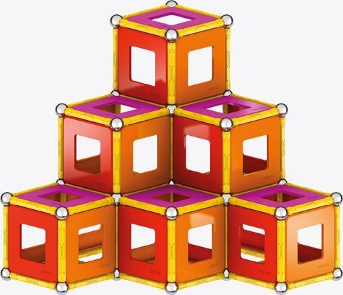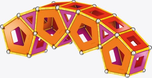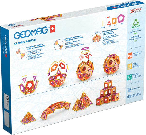 Magnetická stavebnica GEOMAG Classic Panels zo 100% recyklovateľného materiálu. Stavebnica obsahuje 64 žltých magnetických tyčiek, 56 oceľových guličiek, 38 trojuholníkových, 30 štvorcových a 12 päťuholníkových plastových výplní v kombinácii oranžovej, červenej a fialovej farby. Celkom 200 dielikov. Stavebnica je určená pre deti od 5 rokov. Vyrobené vo Švajčiarsku.
