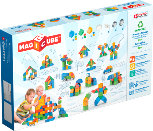 Geomag Magicube Shapes 25 dielikov je stavebnica určená pre deti od jedného roka, ktorá ponúka široké možnosti kreatívneho tvorenia vďaka magnetickým dielikom v rôznych tvaroch a farbách. Sada obsahuje celkom 25 dielikov, pričom okrem klasických magnetických kocôčok sú tu aj štyri kolieska a ďalšie tri špeciálne tvary, ktoré umožňujú stavbu nielen statických modelov, ale aj pohyblivých vozidiel. Vďaka magnetickému spoju je možné jednotlivé dieliky ľahko spájať a prestavovať, čo podporuje rozvoj jemnej motoriky i predstavivosti.