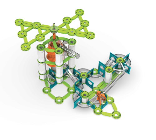 Súčasťou balenia je 183 dielov vyrobených z recyklovaného plastu, čo zdôrazňuje ekologický aspekt výrobku. Diely sú farebne ladené prevažne do zelenej, bielej a oranžovej farby, pričom niektoré prvky sú priehľadné, čo umožňuje lepšie pozorovanie funkčných častí motora počas prevádzky. Konštrukcia obsahuje rôzne typy spojovacích prvkov, stĺpiky a špeciálne komponenty, ktoré umožňujú zostavenie komplexných a stabilných modelov.