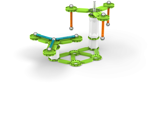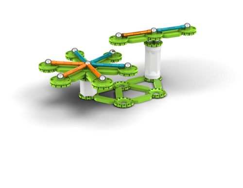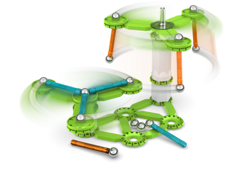 Súčasťou stavebnice sú magnetické tyčky v rôznych farbách – modrej a oranžovej – a zelené základné dielce, ktoré slúžia ako nosné a spojovacie prvky. Guličky, ktoré fungujú ako ložiská, sú kovové a ich použitie umožňuje hladký a efektívny pohyb súčiastok. Vďaka kombinácii týchto prvkov je možné zostaviť rôzne mechanizmy s otáčavými časťami a prevodmi, ktoré demonštrujú princípy magnetickej sily a mechanického pohybu.